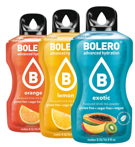 Bolero to elektrolity bez cukru w formie wygodnych saszetek do rozpuszczania w wodzie. Każda saszetka wystarcza na 0,5 - 1 litr wody.