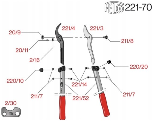Model FELCO 221 wyposażony jest w niezwykle wydajną głowicę tnącą. Jego zakrzywione ostrze jest produkowane przy użyciu specjalnego procesu szlifowania wyłącznego dla FELCO, co znacznie poprawia trwałość krawędzi tnącej. Nowa geometria ostrza pozwala na lepszą penetrację w twardym drewnie i wymaga mniejszego wysiłku, a jednocześnie pozwala na precyzyjne cięcia na czubku.