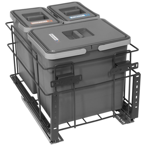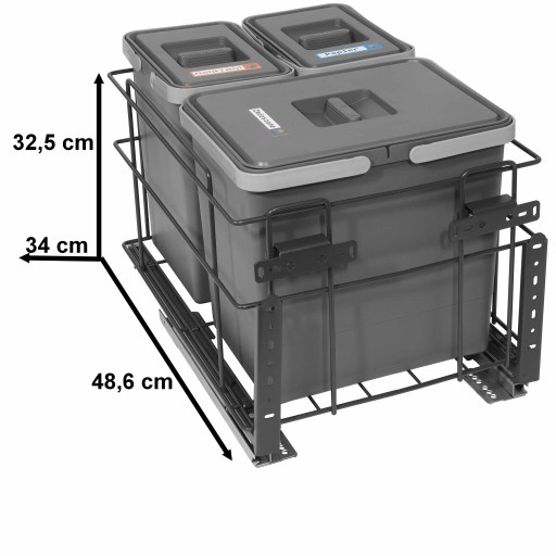 Zestaw składa się z dwóch koszy z pokrywami, stalowego stelaża, wysokiej jakości prowadnic dolnego montażu z funkcją pełnego wysuwu i cichego domyku oraz kompletu mocowań.