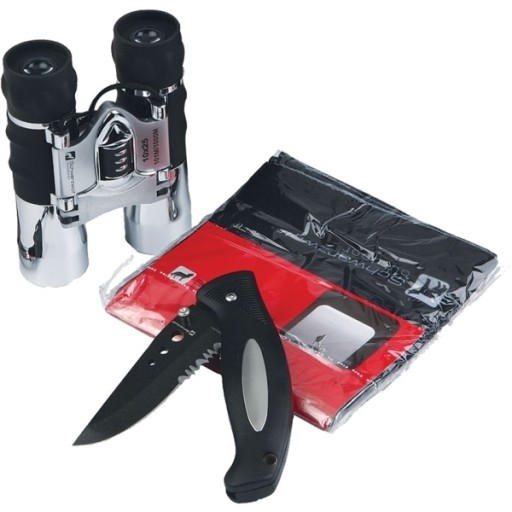 Zestaw turystyczny Schwarzwolf. Zawiera: składany nóż ze stali nierdzewnej ze sprzączką, wielofunkcyjną chustę, 10 x 25 lornetkę oraz neoprenowy pokrowiec.