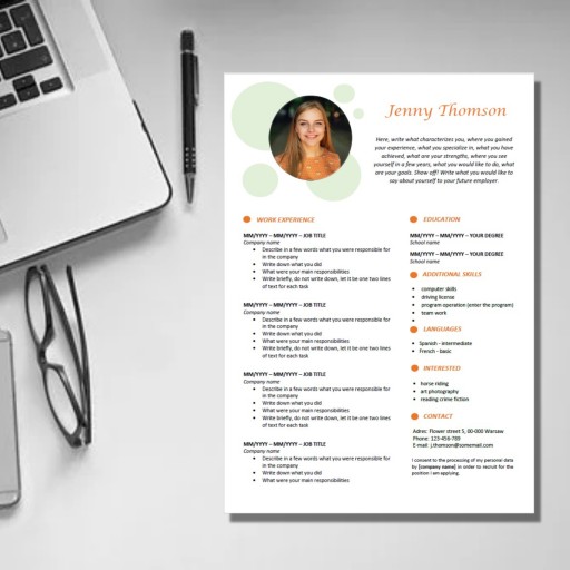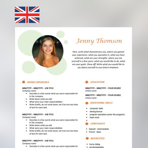 Edytowalny szablon CV w wersji angielskiej, w którym możesz w łatwy sposób zmienić według własnych potrzeb: treść, kolory, zdjęcie, wielkość i rodzaj czcionki.