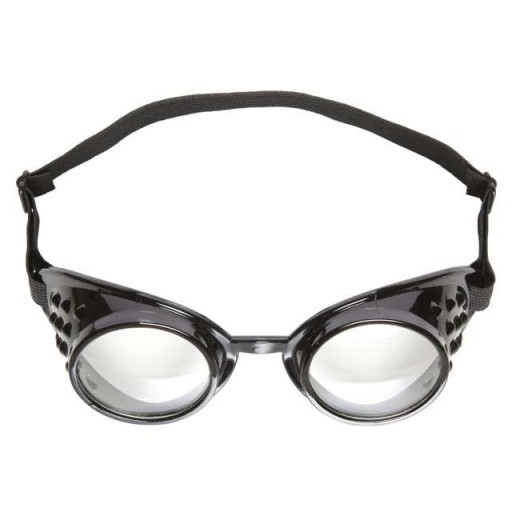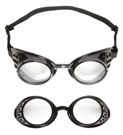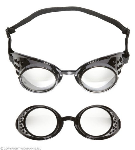 Okulary dla pilota z lat 20., 40. Mogą posłużyć również jako okulary szalonego doktorka w laboratorium. Oprawki na gumce wykonane z sylikonu. Po bokach ozdobione wypustkami. Są elastyczne. W środku umieszczono przezroczyste szkła.