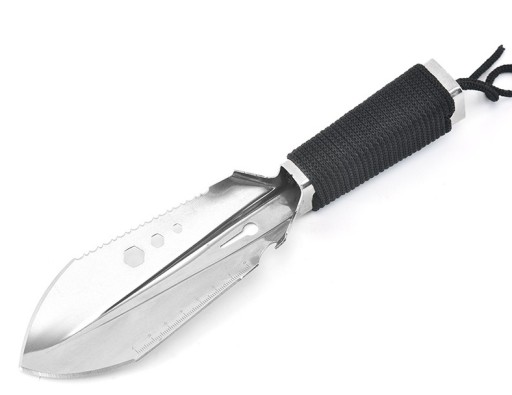 Wielofunkcyjna saperka, wykonana z metalu, ze sznurkiem owiniętym wokół rękojeści.