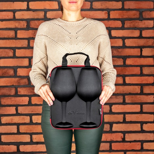 Zestaw zawiera eleganckie czarne etui oraz dwa kieliszki do wina. Kieliszki pozwalają cieszyć się winem bez konieczności jego dolewania.