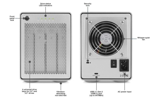 - Obsługiwane dyski: 4x 2,5-calowe lub 3,5-calowe dyski SATA