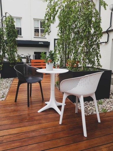 Nogi krzesła to również tworzywo, które dzięki swojej teksturze imituje drewno. Wykonanie krzesła z tworzywa gwarantuje, że jest one odporne na wilgoć i szkodniki, w przeciwieństwie do krzeseł drewnianych. Krzesło Dacum idealnie współgra ze stołem Bloom.