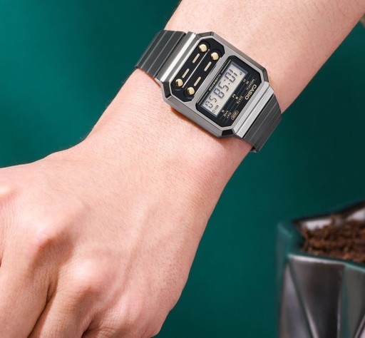 Klasyka lat 80tych w nowym wydaniu. Model CASIO A100WEGG-1A2EF to zegarek unisex pasujący zarówno na damską jak i męską rękę. Casio Digital Vintage to sportowy zegarek z ciekłokrystalicznym wyświetlaczem wyświetlającym podstawowe funkcje jak aktualny czas, datę, stoper czy alarm. Prostokątna koperta o przyciętych rogach idealnie wpasowuje się w stylistykę retro. Nowa stylistyka tarczy nawiązująca do gier telewizyjnych z późnych lat 80tych. Solidny zegarek elektroniczny japońskiego producenta na stalowej bransolecie oferowany jest w oryginalnym pudełku CASIO VINTAGE wraz z kartą gwarancyjną i instrukcją obsługi w j. polskim. Produkt nowy i oryginalny.