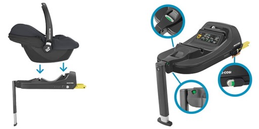 Baza umożliwiająca łatwy i szybki montaż fotelika Maxi Cosi Cabriofix i-Size w większości samochodów wyposażonych w system ISOFIX.