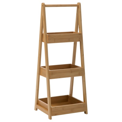 Regał charakteryzuje się pięknym kolorem naturalnego drewna bambusowego oraz ciekawą konstrukcją, dlatego doskonale sprawdzi się jako dodatek do łazienek wykończonych w stylu boho.