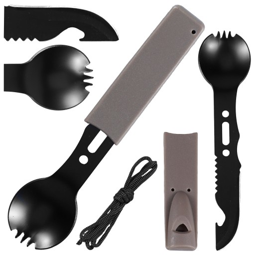 Spork 8w1 to outdoor'owy niezbędnik ze stali nierdzewnej oraz tworzywa sztucznego (trzonek łyżki/gwizdek). Idealny w warunkach survivalowych, bushcrafcie, podczas biwakowania, obozów czy wyjazdów turystycznych. Jest lekki - 42g i zajmuje bardzo mało miejsca. Dzięki sprytnej budowie zastawę stołową zamknięto w jednej, wygodnej formie. Niezbędnik łatwo utrzymać w czystości. Jest wielokrotnego użytku. Spork sprzedawany jest wraz z linką, którą można zapleść naokoło, aby służyła jako trzonek noża. Może też posłużyć do tworzenia harpuna w celu złowienia ryby lub jako linka do zawieszenia sporka na szyję czy plecak.