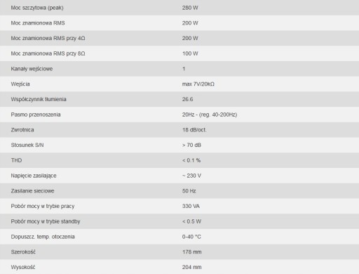 - Regulowany filtr dolnoprzepustowy: 40-200Hz (18dB)