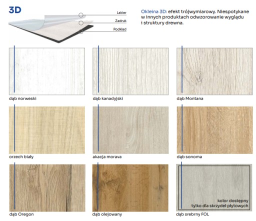 Folia 3d - daje efekt trójwymiarowy. Niespotykane w innych produktach odwzorowanie wyglądu i struktury drewna. Odporna na ścieranie.