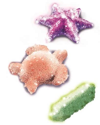 Przeprowadź eksperymenty z pomocą bogato ilustrowanej instrukcji i wykonaj fluorescencyjne kryształy w kształcie gwiazdki czy żółwika, które będą świecić w ciemności.