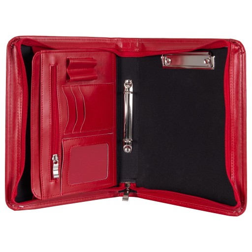 Wewnątrz biwuara znajdują się 2 przegrody, , kieszonka na zamek, miejsce na wizytówki oraz długopisy. Posiada klips na dokumenty A5 oraz mechanizm ringowy na koszulki. Zamykana na dobrej jakości zamek błyskawiczny.