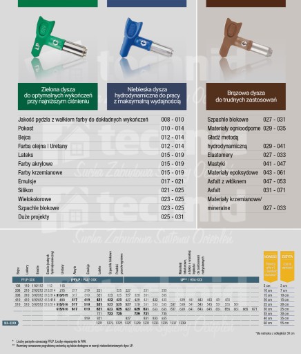 Rozmiary dysz rekomendowanych do aplikacji odpowiednich materiałów: