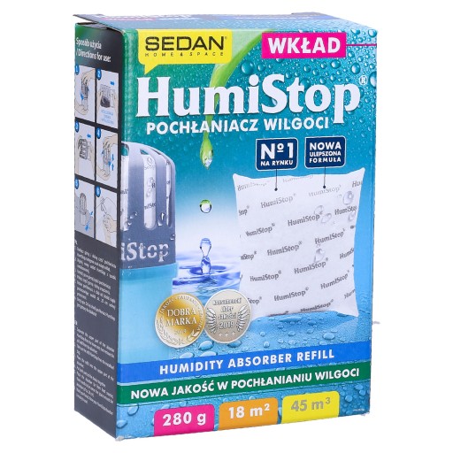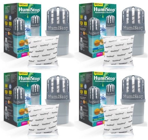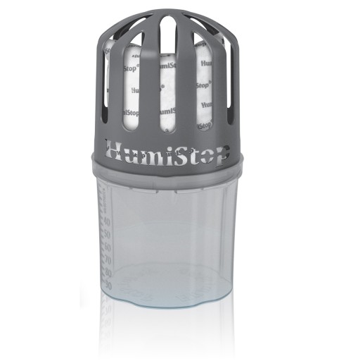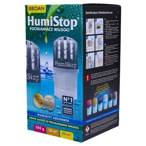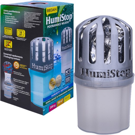 Humi Stop to skuteczny, nowoczesny pochłaniacz wilgoci, który nie wymaga podłączenia do prądu. Urządzenie dostępne w zestawie z pojemnikiem i wkładem. Produkt przeznaczony do regulowania wilgotności powietrza dzięki wkładowi kontrolującemu stężenie pary wodnej. Wysoki poziom wilgoci niesie ze sobą ryzyko zaparowania okien, rozwoju pleśni i przyspieszenia korozji urządzeń metalowych. Nadmiar wilgoci wpływa też negatywnie na zdrowie, mogąc prowadzić do alergii. Humi Stop niweluje to ryzyko będąc w pełni bezpiecznym dla zdrowia ludzi i domowych zwierząt. Wkład załączony do zestawu wystarczy na 3 miesiące działania.