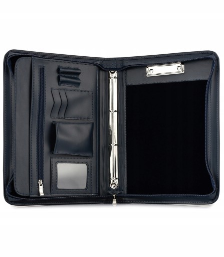 - po lewej stronie: 2 kieszenie na smartfon, dokumenty, 3 schowki na wizytówki, 2 komory na długopisy, 1 przegroda na dokumenty A4, 1 przegroda na dokumenty A5, 1 zasuwana komora na mniejsze dokumenty.