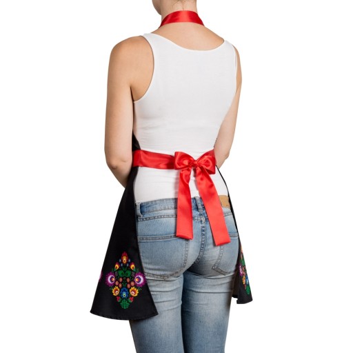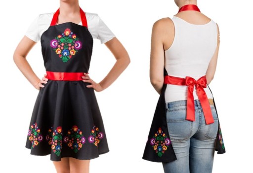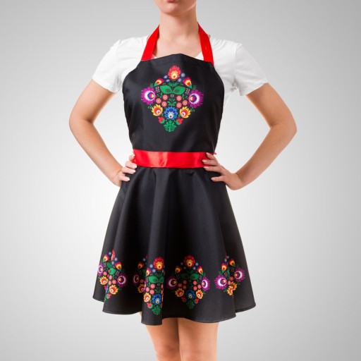Fartuszek w folkowe wzory, który chroni kreację wieczoru przed plamami