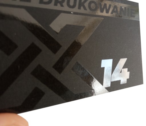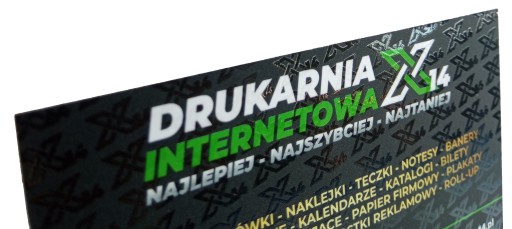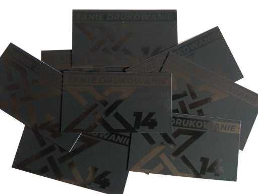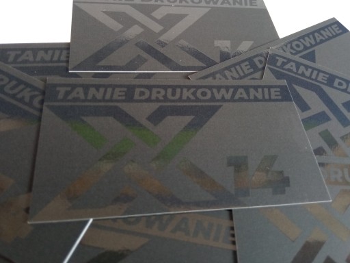 Na powyższych zdjęciach lakierem wybiórczym jest pokryty logotyp oraz tekst "TANIE DRUKOWANIE", na drugiej powtarzający się wielokrotnie logotyp w tle. Co istotne i ciekawe elementy, które chcemy polakierować nie muszą być w ogóle zadrukowane - czyli tak jak na pierwszej stronie prezentowanej tutaj wizytówki. Nie jest tam użyty nadruk w kolorze a tylko i wyłącznie pokrycie lakierem wybiórczym.