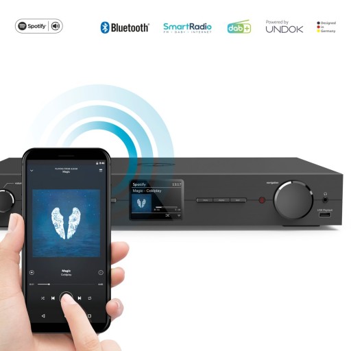 Urządzeniem możesz sterować zdalnie za pomocą swojego smartfona i aplikacji mobilnej UNDOK. Do dyspozycji masz również pilot oraz klasyczny panel sterowania na radiu. W każdej sytuacji bezproblemowo zmienisz stację oraz wyregulujesz głośność.