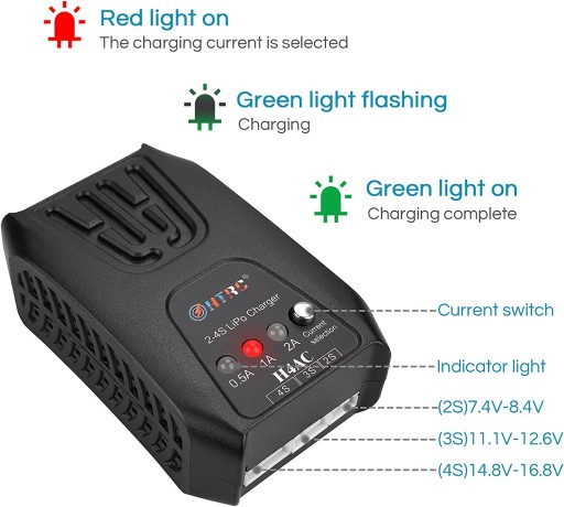- 【Wskazówki dotyczące użytkowania】 Proszę zrozumieć atrybuty swojej baterii i wybrać rozsądny rozmiar prądu, który pomoże chronić żywotność baterii. Skutecznie chroń żywotność baterii Lipo: bateria Lipo 2000mAh bateria 0.5A/1A/2A (ładuj tylko baterie, które spełniają specyfikacje tej ładowarki).