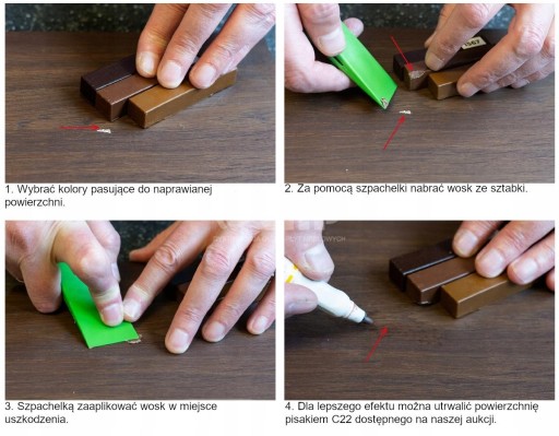 Po oczyszczeniu i odtłuszczeniu uszkodzonego miejsca wprowadzić przez docisk szpachelką odpowiednią porcję wosku. Zebrać nadmiar szpachelką. Dla lepszego efektu można utrwalić powierzchnię pisakiem retuszerskim dostępnym na naszej aukcji.