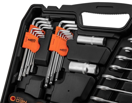 Zestaw kluczy 150 elementów 1/2", 1/4" NEO (nr ref. 10-210) ma wszechstronne zastosowanie w pracach przy naprawach pojazdów i maszyn. Elementy zestawu wykonane zostały ze stali CrV oraz zapakowane w praktyczną i wytrzymałą walizkę z tworzywa sztucznego. Zestaw jest szczególnie bogaty w nasadki i bity o dużej rozpiętości rozmiarowej. 72- zębowe grzechotki w dwóch najpopularniejszych rozmiarach 1/4" i 1/2" oraz przedłużki i przeguby dają mnogość możliwości dopasowania klucza i dotarcia do trudno dostępnych miejsc. Dodatkowo w składzie zestawu znajdują się cztery wkrętaki, klucze płasko-oczkowe oraz dwa komplety kluczy sześciokątnych i Torx zwiększające możliwość wykorzystania zestawu.