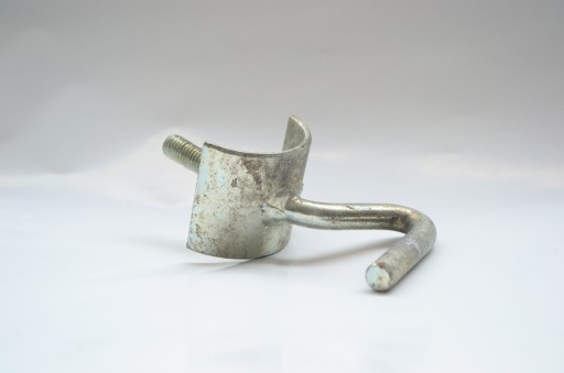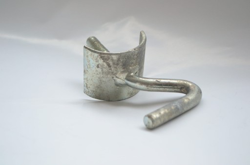 Haczyk uwięzi do stanowiska uwięziowego typu B, produkt ocynkowany. Haczyk spina łańcuch przewieszony przez rurę.