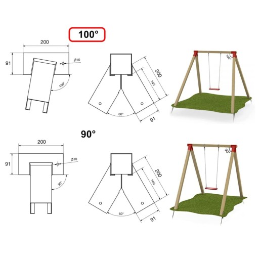 Dzięki tym łącznikom stelaż huśtawki montuje się sprawnie i bardzo łatwo. Nie musisz mieć specjalnych zdolności technicznych. Wystarczy wkrętarka, kilka drewnianych belek i osoba do pomocy, by po chwili cieszyć się stelażem huśtawki. Łącznik 100° oferuje szerszy rozstaw nóg. Konstrukcja taka jest stabilniejsza, ale wymaga więcej przestrzeni.