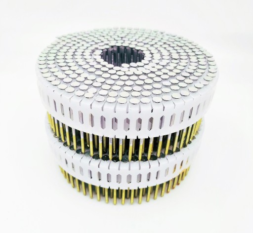 Gwoździe w zwojach łączone plastikiem. Gwoździe posiadają szeroki wachlarz zastosowań.