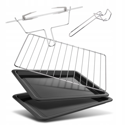 - Wyposażenie: 2 tace Kratka do grillowania Uchwyt Widelec do rożna