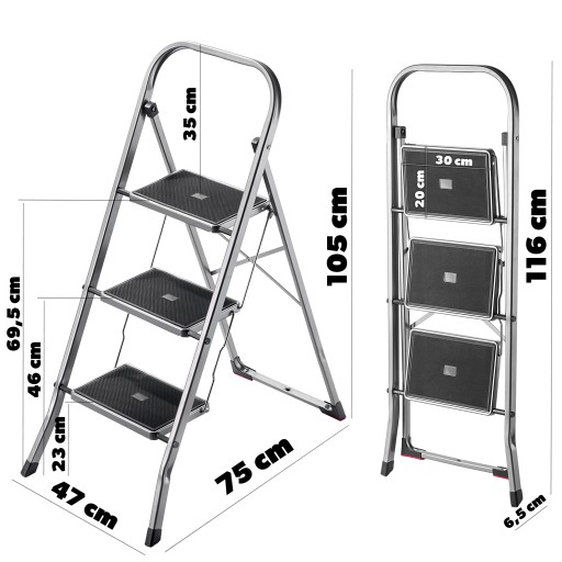 - Wymiary drabiny po rozłożeniu: 47 x 75 x 105 cm