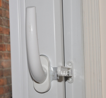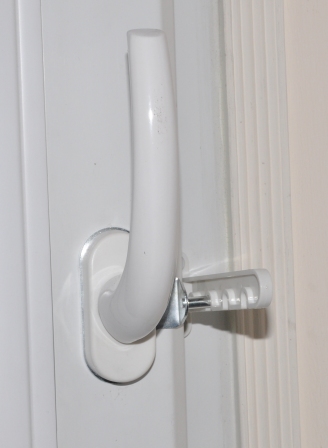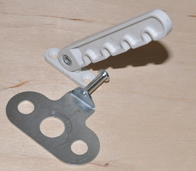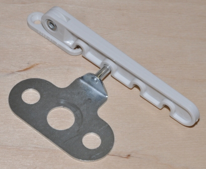 Opis: ramię blokady wykonane jest z tworzywa w kolorze białym a zaczep pod klamkę z blachy ocynkowanej. Blokada służy do blokowania skrzydeł okiennych uchylanych i rozwieranych. Ramię regulowane wyposażone jest w wycięcia, w które wsuwa się zaczep, który blokuje skrzydło okna przed większym rozwarciem lub uchyleniem. Blokada umożliwia uzyskanie szczeliny, która jest nieosiągalna przy normalnym mechanizmie okna. Montaż rozpoczynamy od odkręcenia klamki i włożeniu pod klamkę zaczepu blokady po czym przykręcamy wcześniej odkręconą klamkę tym samym mocując zaczep blokady. Na podstawie zmontowanego zaczepu, ustalamy poziom na jakim możemy zamontować ramię blokady aby spełniała ona swoją funkcję. Montaż polega na przykręceniu ruchomego ramiona blokady do ramy okna (z zębami skierowanymi w dół) na poziomie wcześniej przykręconego zaczepu. Ramię przykręca się dwoma wkrętami o średnicy fi 3,5 - 4,00 mm w taki sposób by znajdowało się obok skrzydła okna, które ma być blokowane na wysokości wcześniej zamontowanego zaczepu. Po otwarciu skrzydła okna, ramię jest umieszczane na zaczepie i okno zostaje zablokowane na wybranym poziomie.