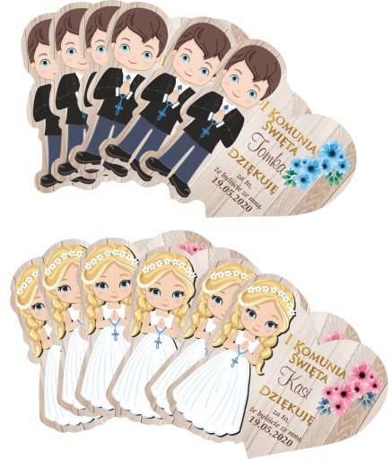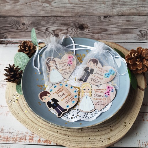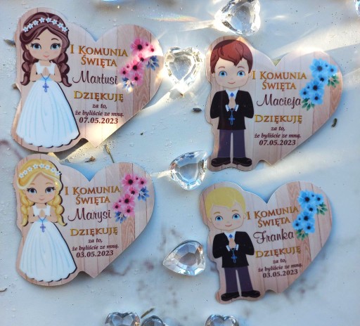 Magnes na I komunię będzie miłym podziękowaniem dla gości za ich przybycie na uroczystość. Do wyboru są wzory dla dziewczynek lub dla chłopców. Magnes dla gości najlepiej prezentuje się zapakowany w uroczy, biały woreczek z organzy.