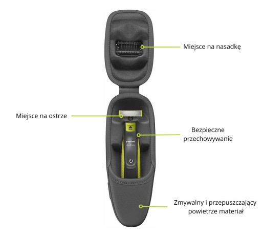 Futerał wyróżnia się prostym, eleganckim designem, który przypadnie do gustu każdemu. Oferuje miejsce na rękojeść i dwa dołączane grzebienie. Etui jest kompatybilne ze wszystkimi modelami OneBlade QP25xx i QP26xx.