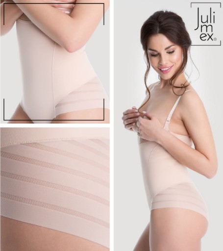 Dzięki opatentowanej technologii Julimex INVISIBLE-LINE® brzegi nie będą tworzyć widocznych linii, a płaskie szwy odznaczać się nawet pod dopasowanymi ubraniami. Boki oraz tył na wysokości pośladków zdobi misterna siateczka, stanowiąca dodatkowy atut modelu. Ramiączka posiadają innowacyjne zapięcie, które zapobiega ich wysuwaniu. W kroku wygodne, stopniowane zapięcie i bawełniana wkładka.