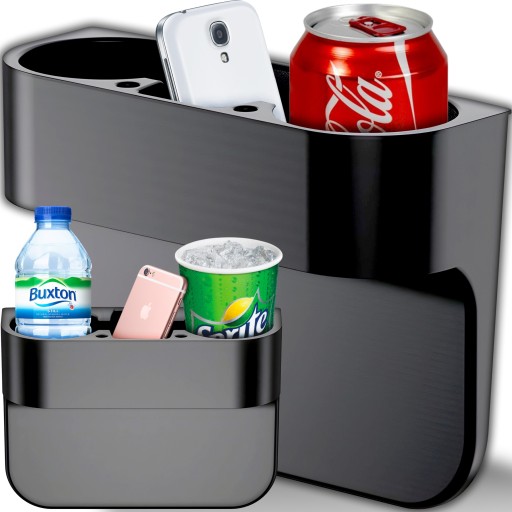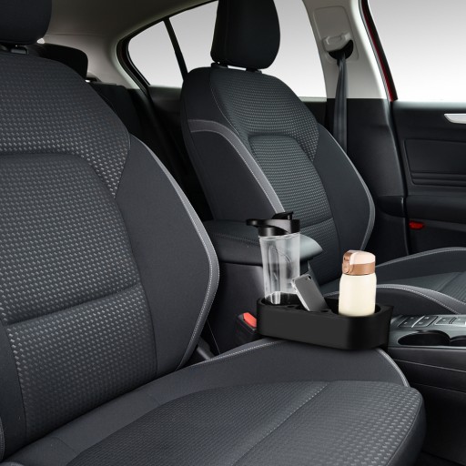 Uchwyt na kubki jest łatwy w zamontowaniu między siedzeniami. Montaż jest niezwykle prosty. Po prostu wepchnij uchwyt między siedzenie i gotowe! Pasuje do większości typów samochodu. Posiada 5 otworów, dwa duże na kubki, puszki lub butelki. Pomiędzy znajduje się kieszonka na telefon lub inne małe drobne rzeczy np. monety. Posiada również dwa małe otwory na długopisy.