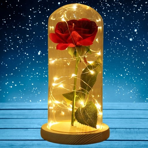Nasza wieczna róża otoczona jest lampkami LED, które ją pięknie podświetlają. Dzięki temu prezentuje się niezwykle efektownie. Postawiony na nocnym stoliku, komodzie lub stole kwiat wytworzy magiczną atmosferę, która przypomni o Twoich uczuciach.
