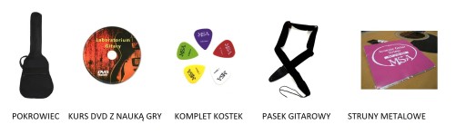 POKROWIEC, PASEK, KURS DVD, KOSTKI DO GRY ORAZ STRUNY ZAPASOWE.