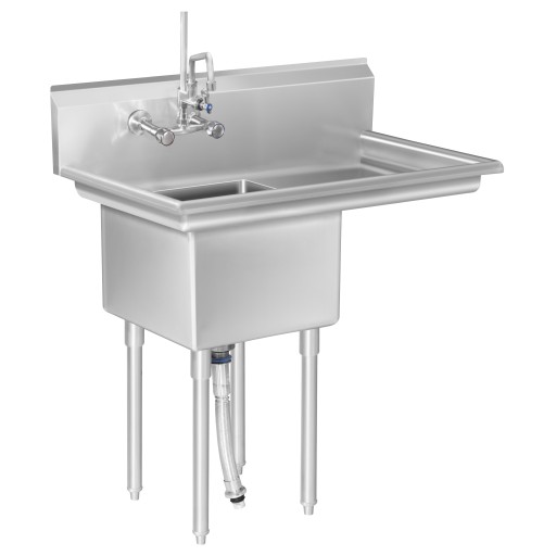 Komplet akcesoriów, jakie dołączone zostały do opisywanego jednokomorowego basenu gastronomicznego, pozwala złożyć stół ze zlewem w sposób samodzielny. W zestawie, oprócz nóżek, znajdują się również rura odpływowa, korek oraz sitko zatrzymujące resztki.