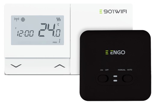 Wbudowany moduł WiFi (w odbiorniku) umożliwia zdalną kontrolę systemu grzewczego za pomocą smartfonu lub tabletu przy użyciu aplikacji ENGO Smart / TUYA Smart.
