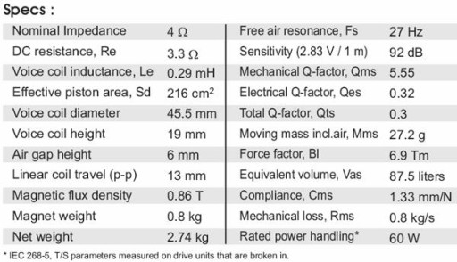 - basreflex z rurą o średnicy około 50 mm i długości 150 mm, objętość od 28 do 35 litrów dla F3 wynoszącego 49 Hz.