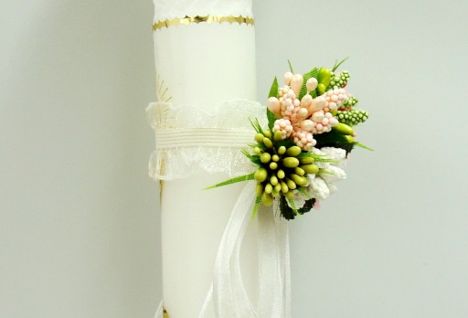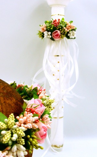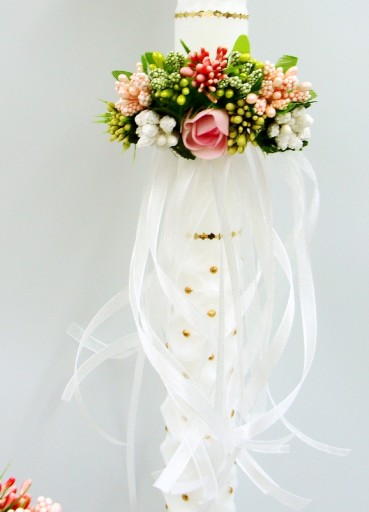 Ozdoba do świecy w tonacji różowo-biało-zielonej.