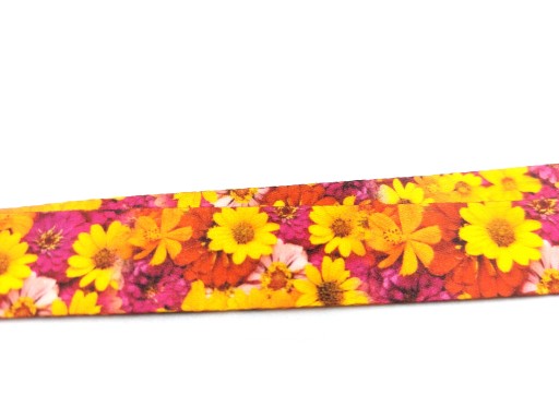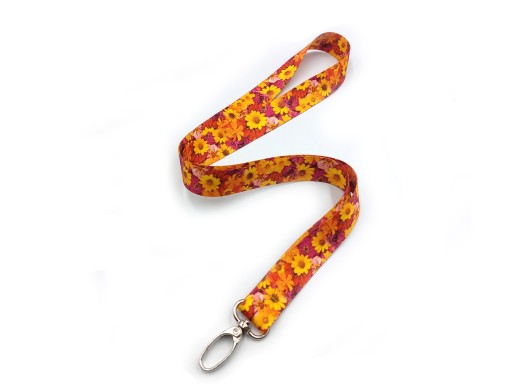 Smycz z nadrukiem w pomarańczowo czerwone kwiaty o szerokości 20mm z metalowym srebrnym karabińczykiem do kluczy