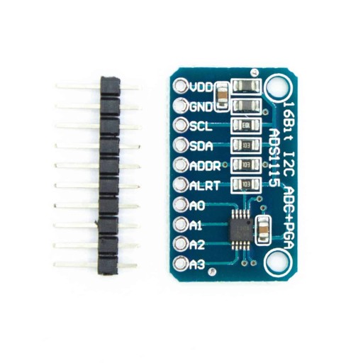 Moduł z przetwornikiem analogowo-cyfrowym ADS115. Układ ten pozwala na maksymalne próbkowanie na poziomie 860 próbek na sekundę. Może być skonfigurowany jako 4 osobne kanały lub 2 różnicowe wejścia.