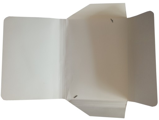 Teczka wielobigowa posiada skrzydełka z wszystkich stron, całość jest domykana gumką (w kolorze białym lub czarnym).