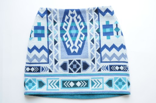 Nietuzinkowa spódnica marki DIVIDED by H&M, trapezowy fason, mini wersja, przepiękne odcienie błękitu, niebieskiego ze śmietankową bielą, tkanina zwarta, nie elastyczna i nie prześwitująca. Do białych kozaczków lub botków w bieli z białym t-shirtem albo koszulową bluzką będzie wzbudzać jeszcze więcej zachwytu! Przepiękny aztecki wzór - Istne cudeńko! Nie czekaj aż inni ją wykupią!