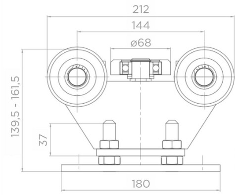 Wózek jezdny do bram przesuwnych samonośnych z 5 rolkami wykonanymi z metalu (w tym z jedną rolką poziomą). Wózek posiada regulację wysokości za pomocą śrub. Jest przeznaczony do szyny 80x80x5 mm i zamocowany na stałe do podstawy.