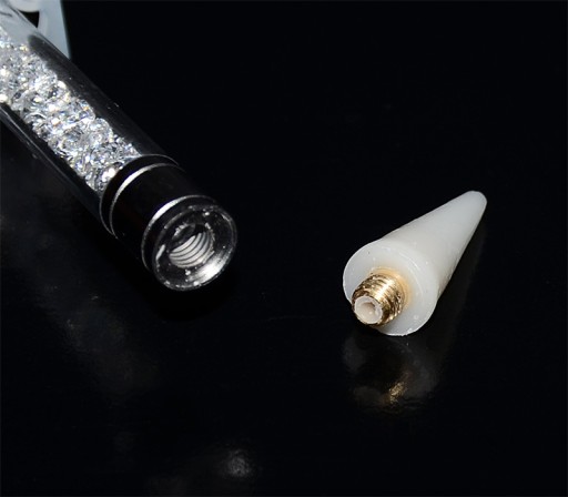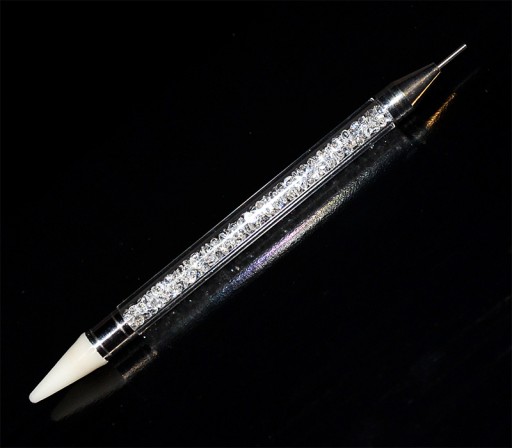 Końcówka woskowa służy do zbierania cyrkonii, a końcówka ze stali nierdzewnej dociska je, aby pozostały na powierzchni paznokcia.