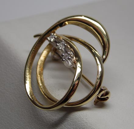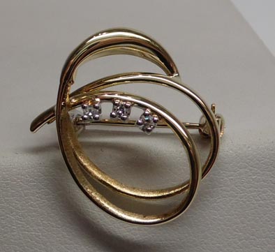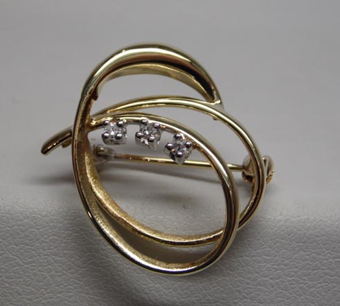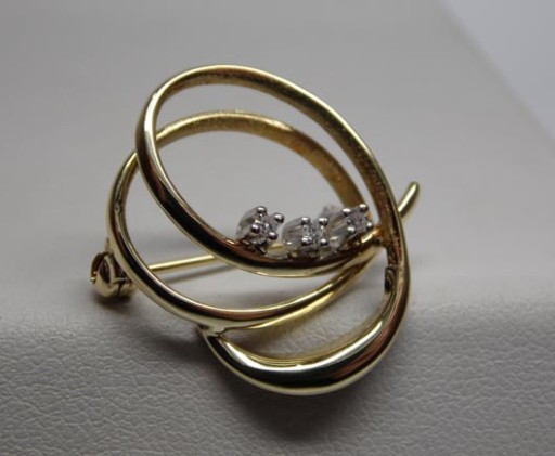ZŁOTA BROSZKA Z DIAMENTAMI PLECIONA OZDOBA. Broszka wykonana ze złota próby 0,585 – 14 karat. Masa 3,360 g. Wymiary 2,31 x 2,42 centymetra. W broszce oprawione są trzy naturalne diamenty o łącznej masie około 0,06 karata. Szlif 8/8 Barwa H (Wesselton) czystość VS Wyrób posiada certyfikat rzeczoznawcy i wycenę na 1400 złotych. Igła do zapinania z zabezpieczeniem. Stan idealny – jak nowa (profesjonalnie wypolerowana, z metką, zapakowana w pudełko)